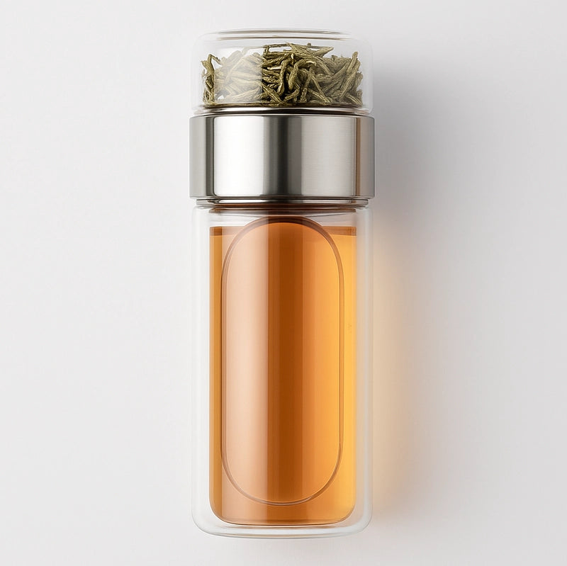 Dzięki temu zapewniony zostaje czysty smak herbaty bez plastiku, troszcząc się o Twoje zdrowie i środowisko. Podwójne ścianki butelki sprawiają, że zewnętrzna część nie parzy i wygodnie leży w dłoni.